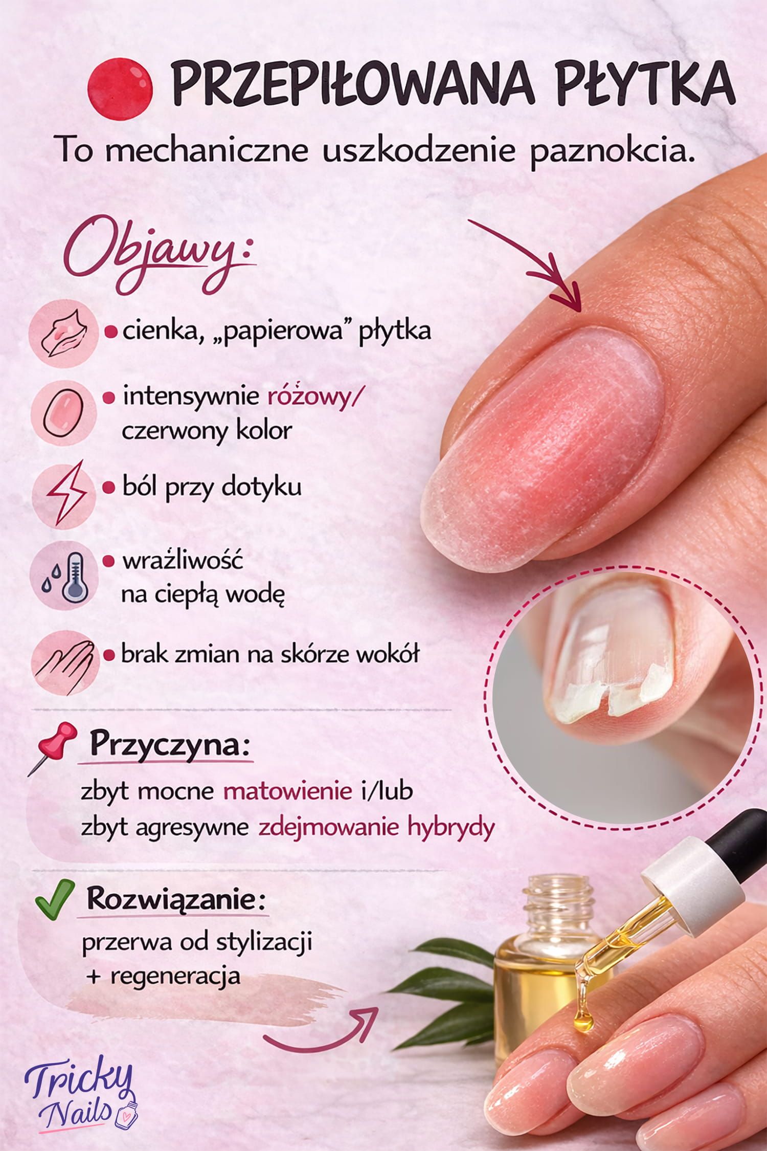 Płytka paznokcia jest najbardziej podatną na uszkodzenia częścią paznokcia, ponieważ jest widoczna i narażona na ciągłe urazy. Płytka paznokcia zbudowana jest z keratyny i składa się z cienkich, sprasowanych warstw. Jeśli te warstwy zostaną nadmiernie spiłowane, mamy problem.