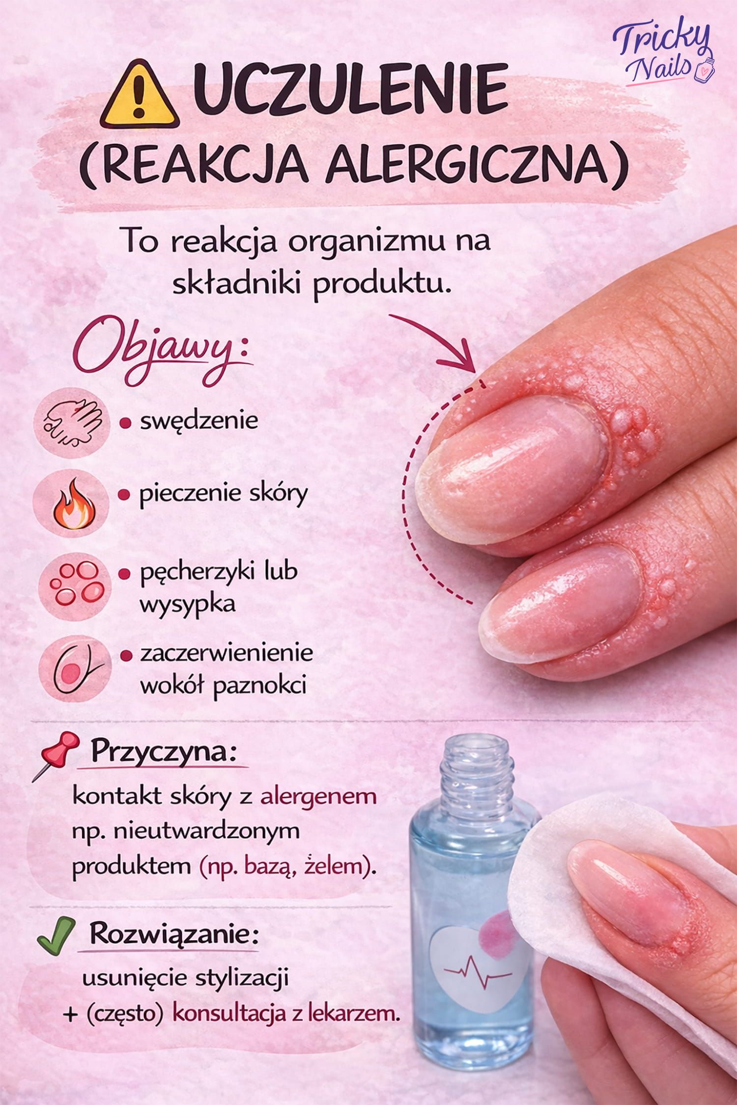 Przyczyna: kontakt skóry z alergenem np. nieutwardzonym produktem (np. bazą, żelem).
