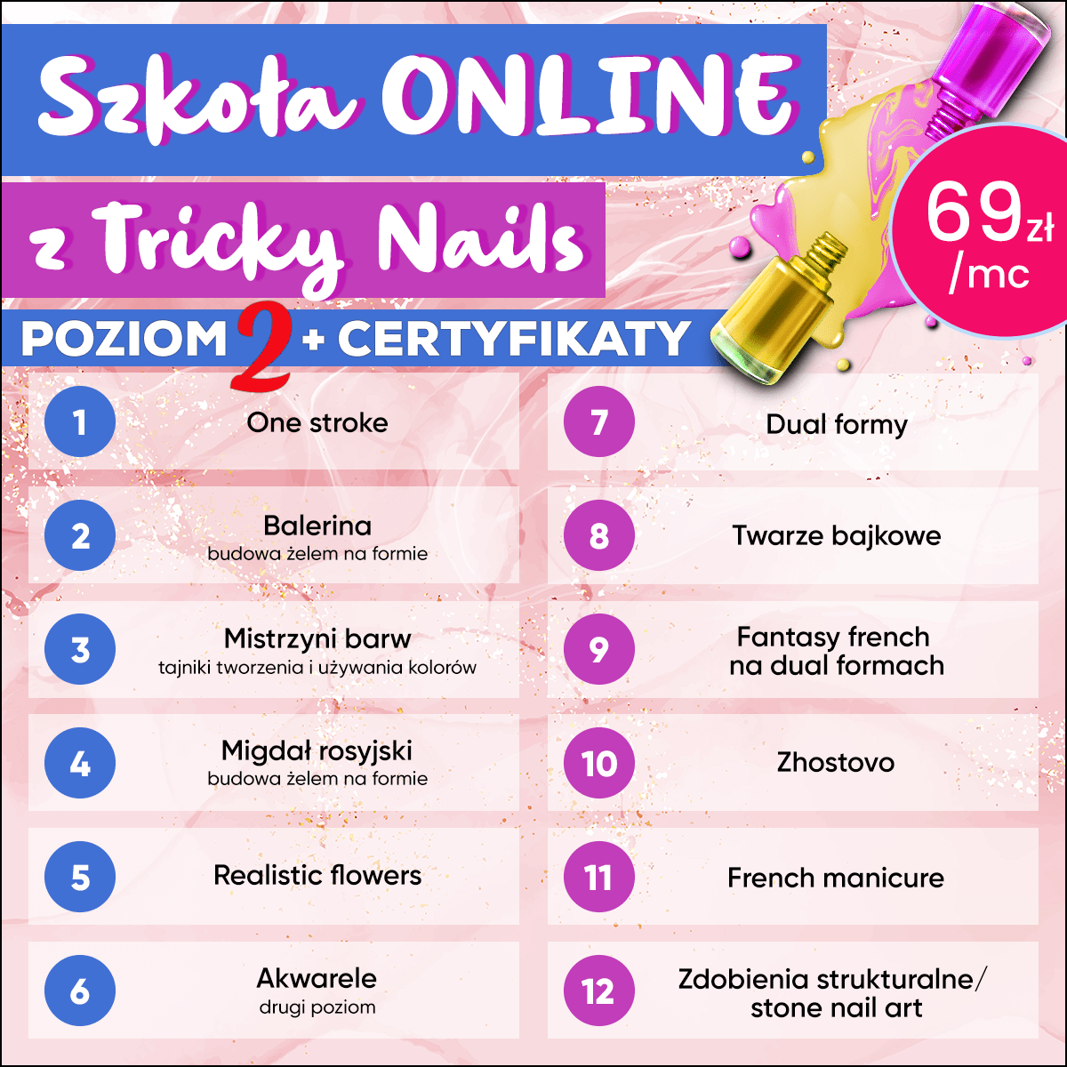 W mojej Szkole stylizacji paznokci ONLINE zrealizujesz jeden z wybranych programów! To ogromna dawka wiedzy – działaj, ćwicz ze mną regularnie, a zapewniam Cię, że za rok o tej porze będziesz z siebie niesamowicie dumna. Zdobędziesz wiedzę, która pozwoli Ci wykonywać bezpieczne, trwałe i estetyczne stylizacje. Poznasz moje triki, ułatwiające pracę oraz produkty, które polecam. Nie zawsze będzie łatwo i nie zawsze będzie Ci się chciało, ale zapewniam Cię – będzie warto!